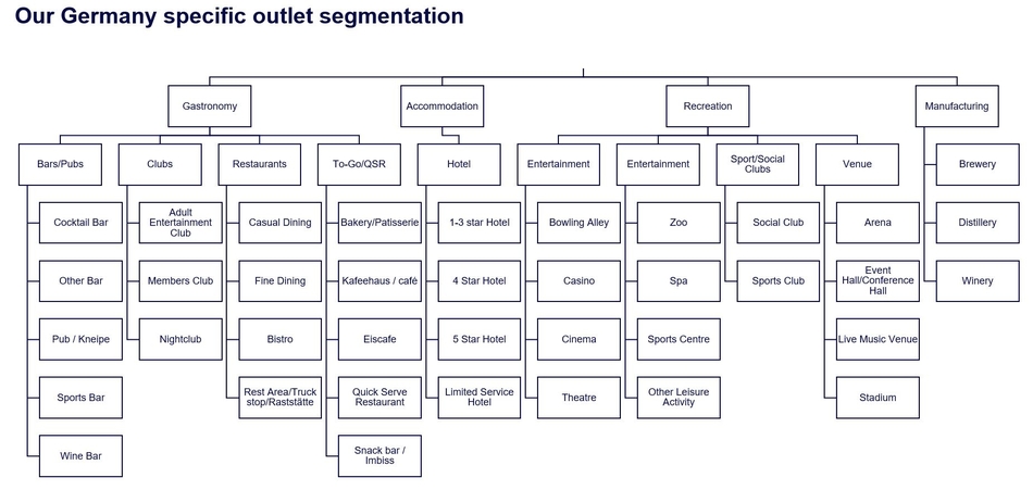 Außerhausmarkt Daten - Mehr Relevanz. Mehr Präsenz. Mehr Erfolg im Außerhausmarkt.![]() Mit dem Outletindex bieten wir Ihnen eine umfassende, qualitätsgeprüfte Adressdatenbank mit über 400.000 Cafés, Bars, Restaurants, Hotels und weiteren gastronomischen Betrieben in ganz Deutschland. Für Hersteller aus dem FMCG-Bereich – ob national oder regional – ist dies ein leistungsstarkes Tool, um gezielt neue Absatzpotenziale zu erschließen und Ihre Distribution strategisch auszubauen. Hierfür bieten wir Ihnen folgende Leistung an: Einzelgeschäftsdaten des Außerhaus-Marktes (Outlet Index) Die genauen Dateninhalte finden Sie nachfolgend.