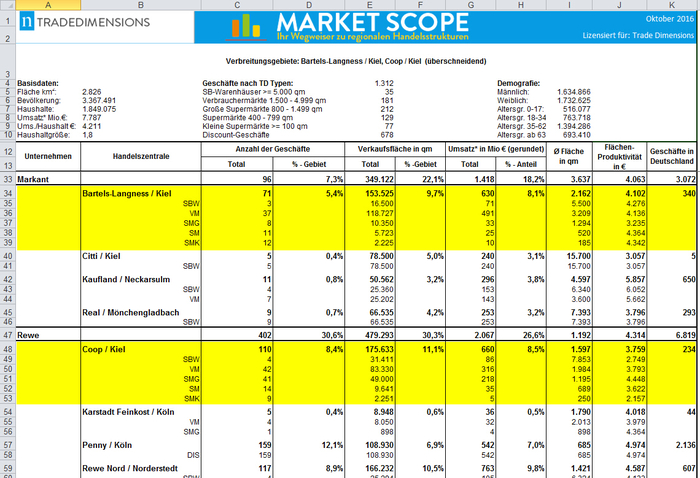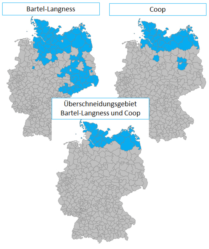 Im Detailreport lesen Sie, dass von Bartels-Langness knapp ¼ seiner Geschäfte (71 von 340) im Coop-Gebiet liegen und etwa die Hälfte der Coop-Geschäfte haben Bartels-Langness in der Nähe.