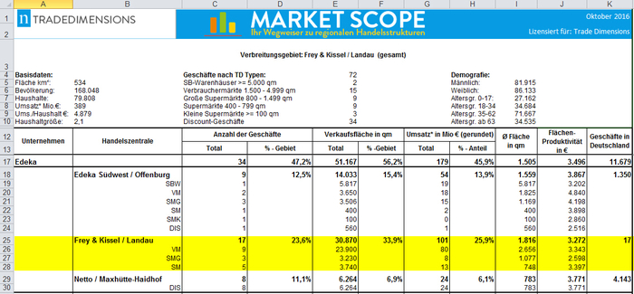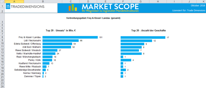 Market Scope: Vorbereitung auf Ihr JahresgesprächBeispiel: Wie wären Sie z.B. mit Frey & Kissel vertreten? Frey & Kissel steht auf Platz 1 in seiner Region, gefolgt von den großen nationalen Unternehmen. Sie erhalten die Bestätigung, dass er als Regionaler in seinem Gebiet der Stärkste ist. Er hat Wettbewerb durch die Big Player wie Aldi, Kaufland, Lidl etc. Seinen Umsatz erreicht er durch relativ viele Geschäfte, nämlich 17, während die anderen im Schnitt 10 Geschäfte haben.