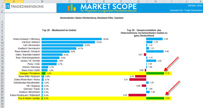 Market Scope: Wie identifizieren Sie regionale Unternehmen?Beispiel: Sie sind in der Region Baden-Württemberg, Saarland und Rheinland-Pfalz vertreten und möchten wissen, wer die regionalen Händler in dieser Region sind und wo Ihr Potenzial steckt. In dem Ranking der TOP 20 sehen Sie, dass der Indexbalken neben den großen nationalen Unternehmen auf 2 Regionale hinweist, nämlich Wasgau und Frey & Kissel. Dieses sind zwei bedeutende Unternehmen, da sie zu den TOP20 der 3 Bundesländer gehören