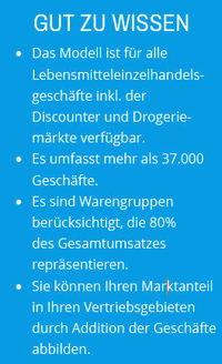 WarengruppenübersichtOb wir Ihre Warengruppe(n) abbilden können erfahren Sie hier. Was erhalten Sie?Jedes LEH-Geschäft (inkl. Drogeriemärkte und Discounter) erhält einen modellierten Umsatz pro Warengruppe plus den %-Anteil am Gesamt dieser Warengruppe. Der Wert berücksichtigt immer ein rollierendes Jahr von 52 Wochen.