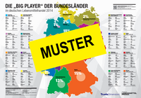 Um regionale Umsatz-Aussagen auf Bundesland-Ebene durchführen zu können, werden die Umsätze auf Geschäftsebene benötigt. Diese Umsätze sind in der Regel Informationen, die von den Handelsunternehmen nicht mitgeteilt werden. Aus diesem Grunde hat TradeDimensions ein Modell entwickelt, um Umsätze der Geschäfte zu berechnen. Alle auf dem Poster verwendeten Umsätze stammen daher aus dieser Modellrechnung. Bei der Modellierung der Einzelgeschäftsumsätze handelt es sich um den Gesamtumsatz eines Geschäftes, dieser schließt auch den Non Food-Umsatz mit ein. Die Modellierung stellt einen potenziellen Umsatz des Geschäftes für ein Kalenderjahr dar. Unterjährige Eröffnungsdaten eines Geschäftes werden bei der Berechnung nicht anteilig berücksichtigt. Um diese Geschäftsumsätze zu berechnen, werden die veröffentlichten Vertriebslinienumsätze eines Unternehmens auf die aktuelle Anzahl der Geschäfte und deren Verkaufsflächen heruntergebrochen. Der ermittelte Ø-Umsatz pro m² eines Geschäftes wird mit der tatsächlichen Fläche des Geschäftes multipliziert. Wettbewerbsindex, privater Kaufkraft-Index und Haushaltsindex auf Kreisebene werden ermittelt und als gleichberechtigte Adjustierungsfaktoren auf den Ø-Umsatz korrigierend angewendet. Alle berechneten Umsätze sind Bruttoumsätze. Nach Ermittlung der Einzelgeschäftsumsätze, werden diese auf Bundesland-Ebene pro Handelsunternehmen kumuliert. Daraus ergeben sich dann die errechneten Marktanteile. |